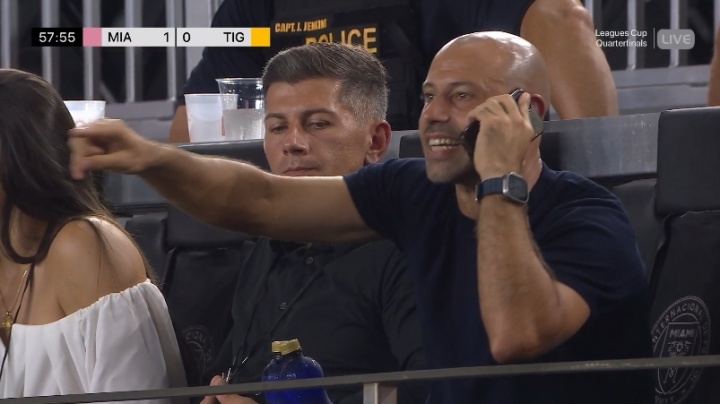 8月21日讯 北美联盟杯1/4决赛,迈阿密国际2-1击败老虎大学,晋级半决赛。迈阿密国际主帅马斯切拉诺上半场结束后抗议裁判,被红牌罚下,但他通过手机指挥球队。